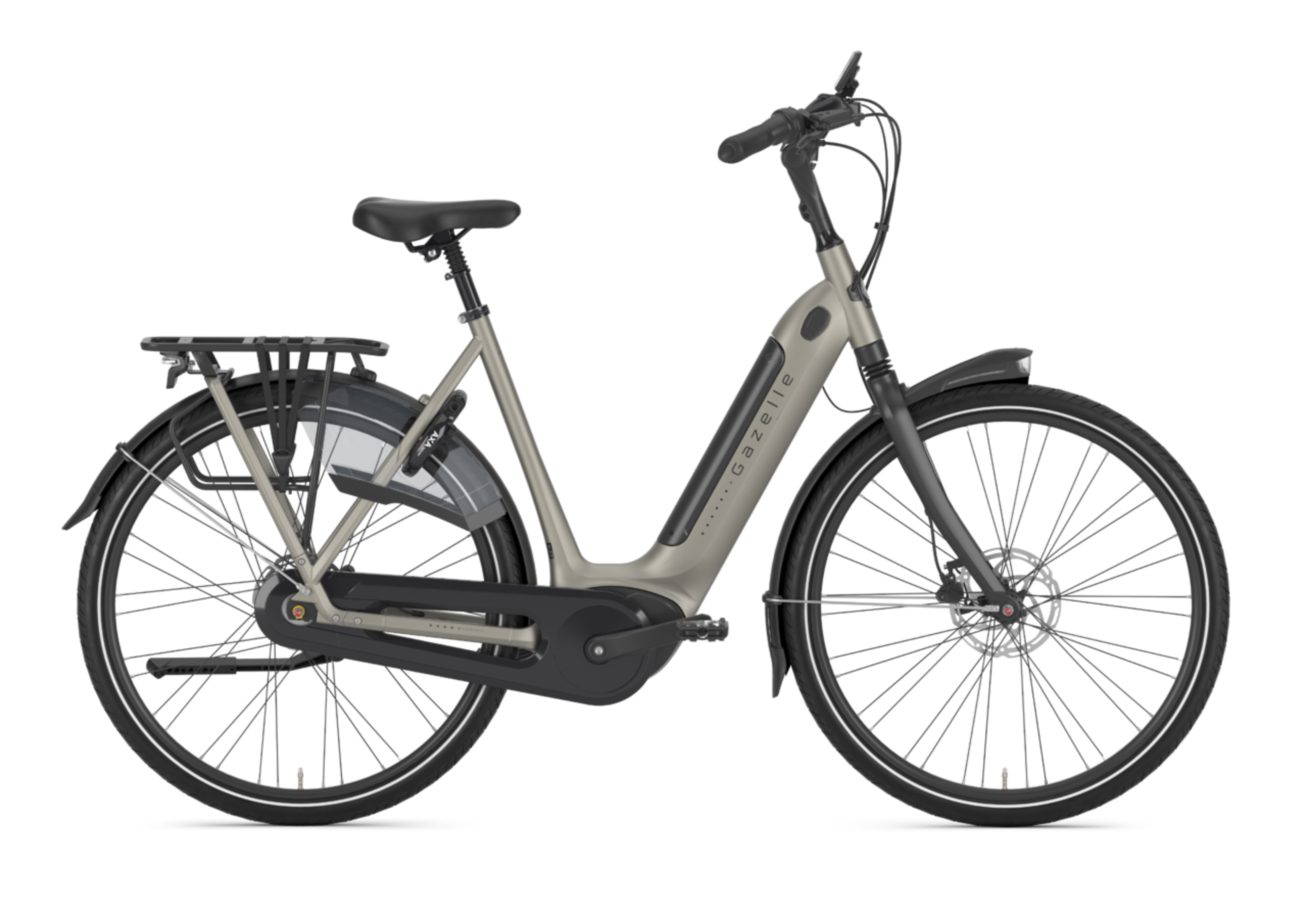 De e-bike heeft brede banden van kwaliteitsmerk Schwalbe waarmee je net wat gemakkelijker over oneffenheden in het wegdek rolt.